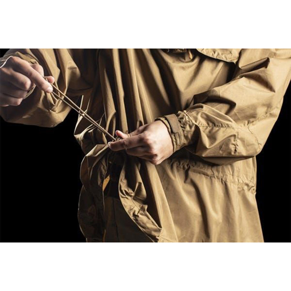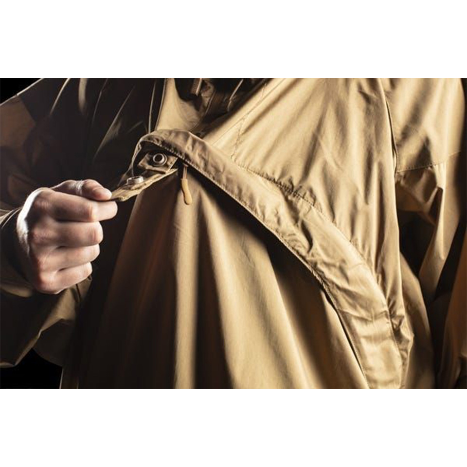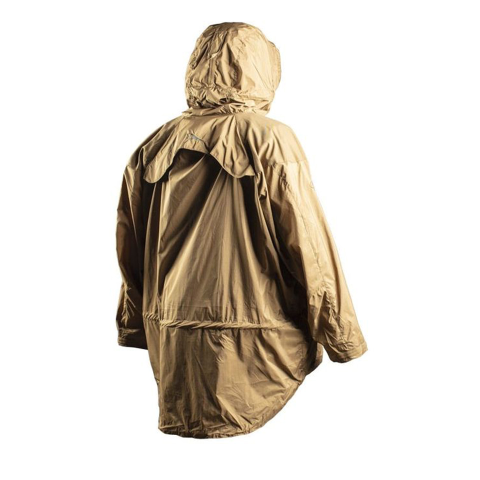 軽量で柔軟なナイロン素材に防水ジッパーとシームを施し雨や風から守ります。デザインは各種装備に上から着ても装備品や動きを阻害しないカットデザインを採用しています。