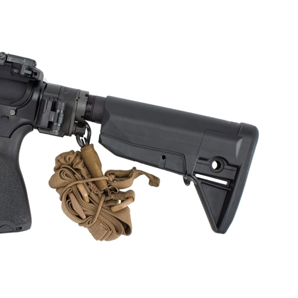 スリングには、バンジーリテンションコードとスピードタブを最奥し、武器に取り付けたままの状態でスリングをしっかり保持できるほか、車両等から降車する際、スリングが車両に引っ掛かるリスクを軽減します。