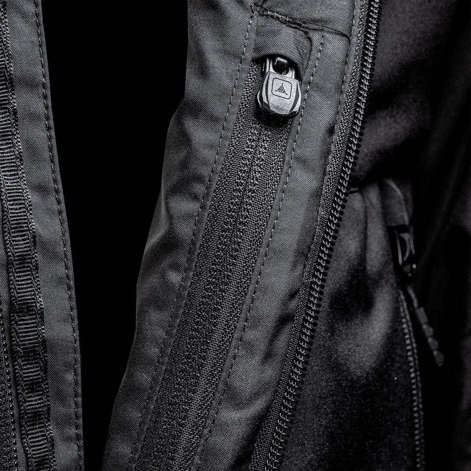 フルフロントダブルコイルジッパー、チンフラップとTADロゴプラグ付き