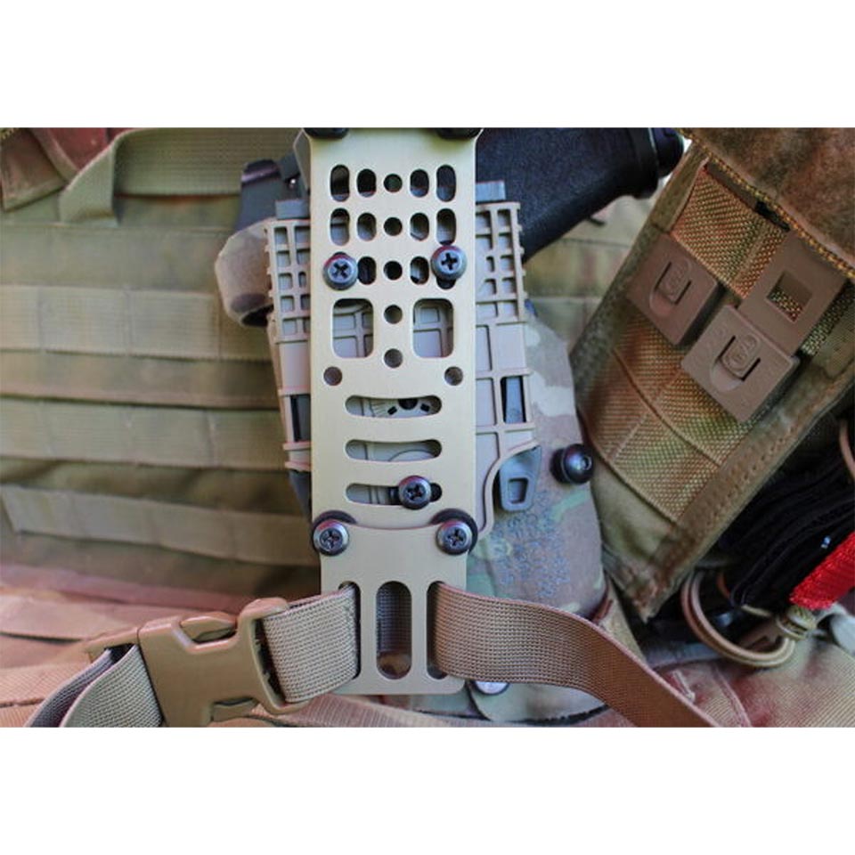 レッグストラップキットの専用ブラケットは、様々なレッグストラップにフィットするように設計されており、Safariland, Blackhawk, Ronin Tacticsなどの幅広で厚みのあるストラップと相互互換性があります。