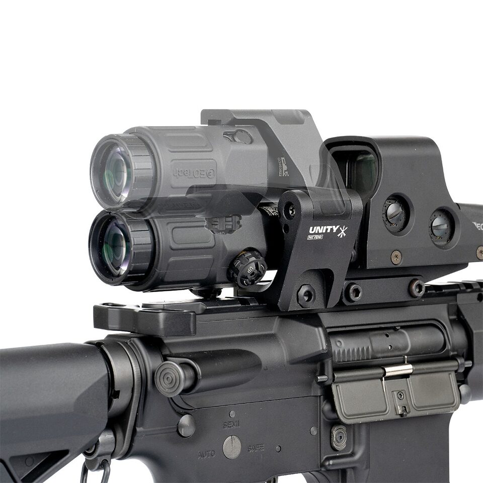 また、L-3 EOTECH MAGNIFIER G33™を逆さに吊り下げ、ホスト武器のレシーバー上の調整ノブに干渉しないようにしますが、