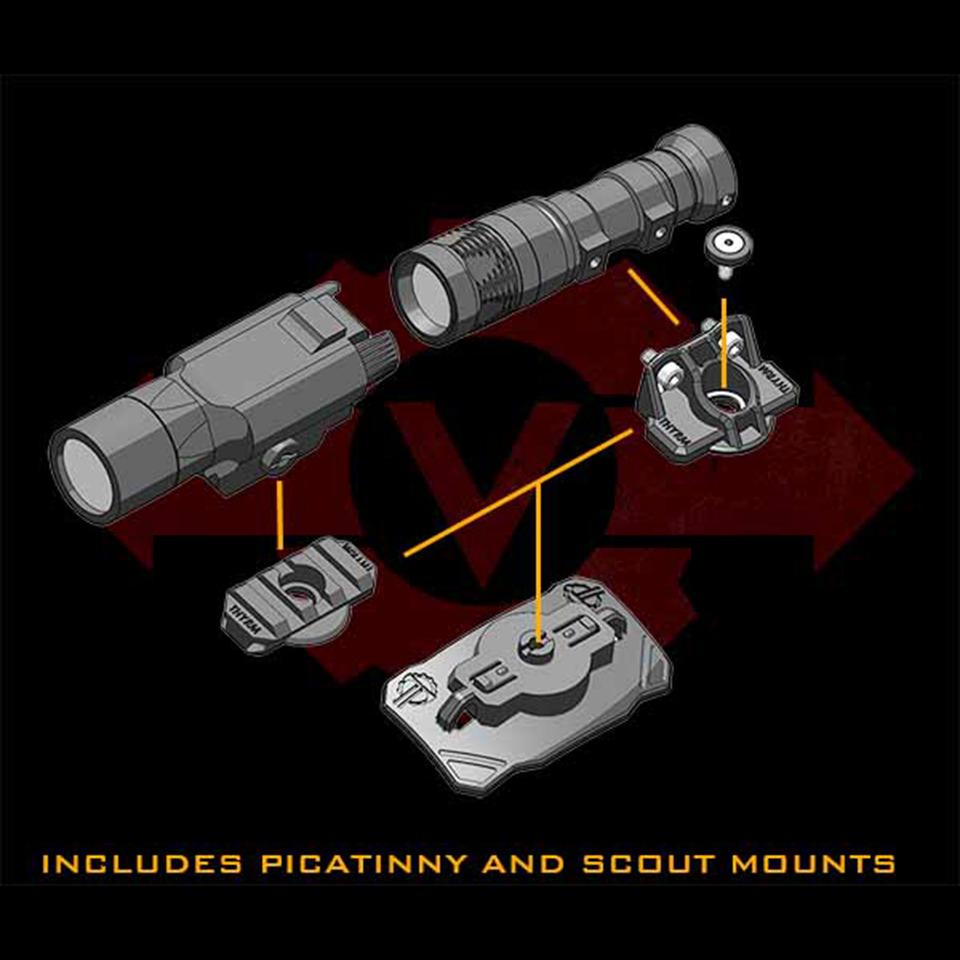 マウント部はピカティニーレールとスカウトライトマウントの両方が含まれており、可視光およびIRライトとの最大限の互換性が可能です。