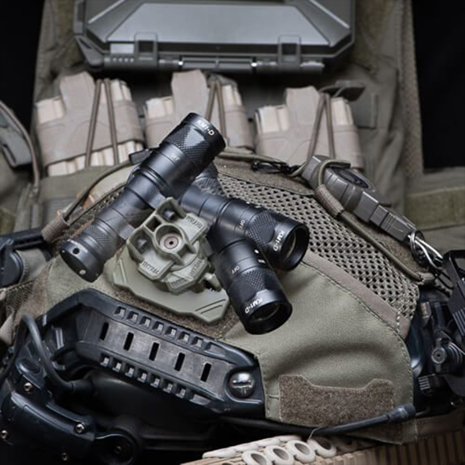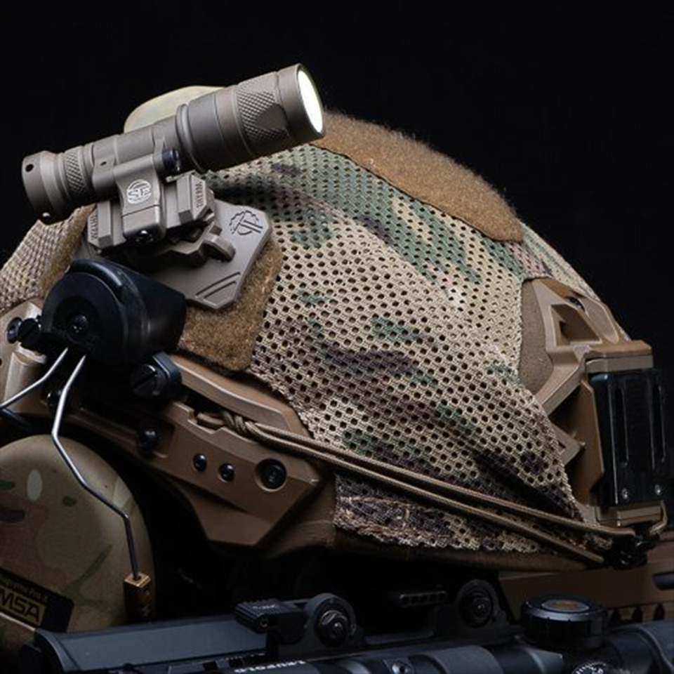 ヘルメットのベルクロ部にピカティニーレールライト/スカウトライトを設置可能